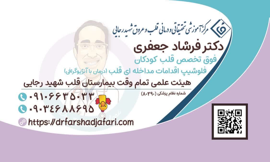 اینجانب دکتر فرشاد جعفری فوق تخصص قلب کودکان و عضو هیئت علمی بیمارستان قلب شهید رجایی تهران می باشم. زمینه فعالیت من پیشگیری، تشخیص و درمان بیماریهای مادرزادی قلب می باشد. همچنین در کودکان و نوجوانانی که بیماری مادرزادی قلب ندارند، مراقبت و توجه به سلامت قلب و عروق آنها، باعث کاهش خطر بیماریهای قلبی عروقی در بزرگسالی خواهد شد. امروزه درمان بسیاری از بیماریهای قلبی کودکان با استفاده از آنژیوگرافی و بدون عمل جراحی مقدور می باشد. اینجانب دارای فلوشیپ اقدامات مداخله ای قلب کودکان (درمان با آنژیوگرافی) بوده و درمان بسیاری از بیماریهای قلب اطفال در بخش آنژیوگرافی بیمارستان قلب شهید رجایی که بزرگترین مرکز برای درمان بیماریهای مادرزادی قلب کودکان است توسط اینجانب انجام می گردد. امیدوارم با راهنمایی و پاسخ به سوالات شما والدین عزیز، قلبی سالم برای فرزندتان و دلی شاد برای شما به ارمغان آورم.